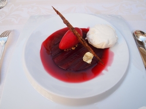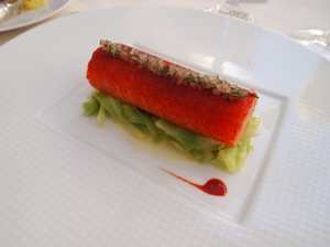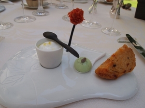先日(2012年9月初旬)訪れた際にいただいたランチのメニューも素晴らしいものでした。トマトをテーマに様々な調理法や温度に仕上げられた3皿の料理、カエルのもも肉のスープのカプチーノ仕立て、その後に、ゼリー固めにしたソースが添えられたサバの一皿と続く、繊細な仕立ての前菜の数々。丸ごとのセップ茸のローストに続き、メインディッシュはフランスでも高級魚とされるヒラメを低温で調理したものでした。サクランボをテーマに4皿ものデザートで締めくくられるこのランチのコースメニューは、一皿一皿のクオリティの高さは言うまでもなく、セップ茸のローストやデザートの一部などをお客の目の前で仕上げや盛り付けをするなど、お客の満足感を高める演出も申し分ありません。これで105ユーロという価格は驚くべきであり、わざわざ味わいに訪れる価値のあるランチだと感じます。