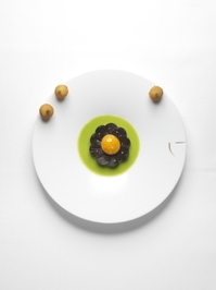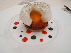 (右)温かい前菜。トマトをテーマとした一皿。ローストしたトマトに"再構築した卵"(この場合は、卵黄がメレンゲに包まれて火通しされたもの)がのせられています。