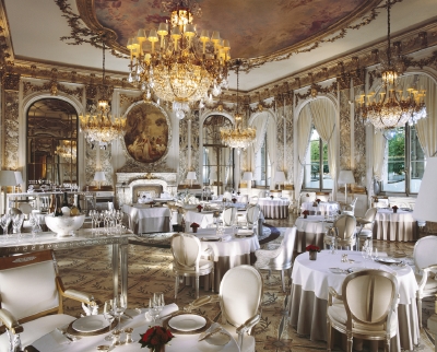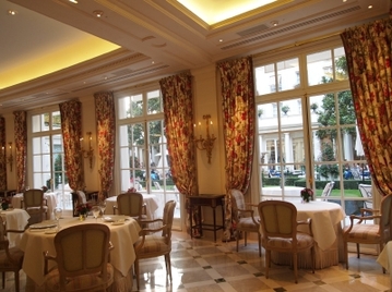 朝食は軽めに済ませ、ランチを堪能するというのもいいでしょう。ミシュラン3つ星クラスのレストランで食事をしようと思うと、だいたいコースのお料理で200~300ユーロ、アラカルトで前菜1品40~80ユーロ、メインディッシュ1品で80~150ユーロくらいが目安になり、挑戦に勇気が必要な価格帯が多いものですが、近頃はディナーの半分くらいの値段設定でランチメニューをしているホテルレストランもたくさんあります。ランチ に足を運ぶレストランのあるパリのホテルの中で、私が個人的に特に気に入っているのが『ル・ブリストル』(注4)と『ル・ムーリス』(注5)です。
