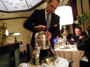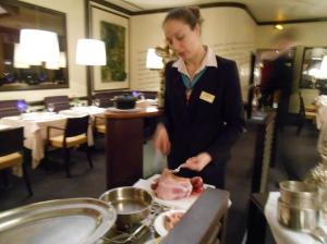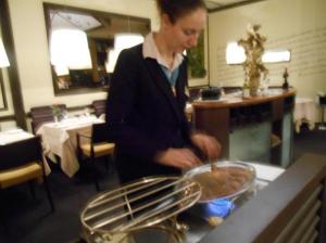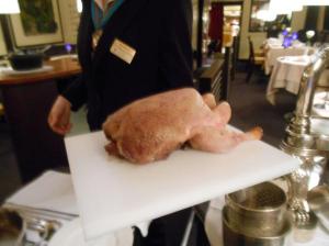 このレストランには「メートル・カナルディエ maître canardier」(注4)がいます。メートル・カナルディエとは、レストランのフロアサービスの中でも鴨料理に特化された特殊な専門職です。お客の目の前で調理した鴨を丸ごとさばき、ソースの仕上げから盛り付けまでをすべて担当します。