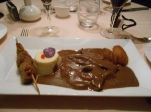 鴨肉は非常に柔らかく、濃厚なソースとよく合います。りんごの程よい酸味が、またいいアクセントです。ボルドーの力強い赤ワインにも負けません。今まで自分自身、それほど多くの鴨肉を食べ歩いてきたわけではありませんが、他の鴨と比べると、やはり肉質の柔らかさ、鉄分をたっぷり含んだような風味が断然違うように思いました。
