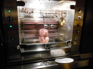 店内に入ると入り口に現れたのは鴨専用のオーブン。鴨を焼くのに特化されていて、1度に3羽まで焼けます。このオーブンで吊るして焼き、程よく焼きます。下味となる味付けは塩コショウのみです。