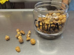 (左)原料は「チュファ」と呼ばれる植物の地下茎(ビンの文字はスペイン語表記)