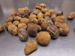 (右)ナッツのように見えるが、乾燥されたものは非常に硬く無臭