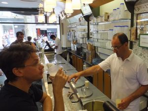 (右)オルチャタを飲みながらカウンターで一息つく客