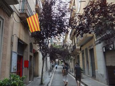 (右)街のいたるところで民家の窓際に掲げられたカタルーニャの国旗を見かける
