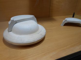 粘土を空気を出すように練り、機械にセット。足元のスイッチを踏むとろくろが回り始め、セットした粘土に濡らしたスポンジを上から押し当てると遠心力が働いて徐々に薄く伸びてゆき、最後に機械で上からプレスして高台(底の形)を作ります。