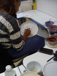 いよいよ絵付けです。先ほど述べたように素焼きの陶器は大変乾燥しているため、塗った釉薬がすぐに染み込んで乾いてゆくので色が混じる心配がなく、陶磁器は焼成後に1番外側に塗った釉薬の色が出てくるので、下の層の色と重なっていい色合いを生み出します。しかし、釉薬がすぐに乾くということは、絵付けはやり直しのきかない1発勝負という事でもあります。大きいものだと1日何時間もかけての絵付けもザラにあるそうですが、序盤であれ、終盤であれ、ミスしたものは売り物にできないとか。厳しい職人の世界ですね。