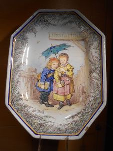 着物を着た女性とブルターニュの民族衣装を着た男性。一見関連性のないこの2つが見事に皿の上に表現され、伝統的なカンペール・タッチで描かれたその絵は、何の違和感もなく見る人の心を引き付ける、そんな皿でした。これまで培ってきた歴史を尊重しつつ、新たな試みにも門戸を開くカンペール焼きの伝統は、こんなところにも現れているようです。