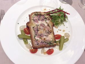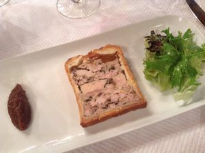 2品目は、自家製の「パテ・アン・クルート」。先に紹介したダニエル・エ・ドゥニーズでも頂きましたが、こちらのものはより大きく、具材も鴨やフォアグラ、きのこなど、より多くのものが使われていました。