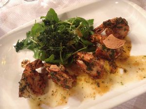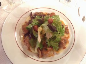 こちらで頂いた料理は、まず1品目は自家製の「パテ・アン・クルート」。細かくした肉や野菜類を、うま味が逃げ出さないようにパイ生地で包んでオーブンで焼いた料理でフランスの古典的な前菜です。2品目は子羊の胸腺肉のサラダ。胸腺肉とは子牛や子羊の喉にある臓器で、ふわっとしてなめらかな食感を持ち、フランス料理では珍重される食材です。