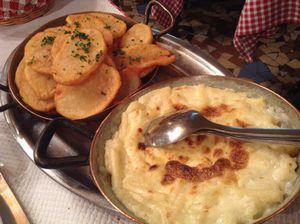 メインには大きな海老をにんにくとパセリで香りづけして焼いたものをいただきました。マカロニグラタンとジャガイモを揚げたものが付け合わせとして供されます。