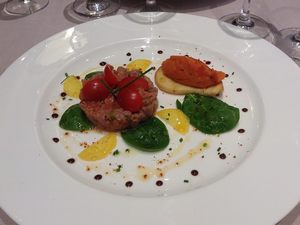 まず1品目は、レモンサブレを添えたマグロのオイル漬けと、トマトをあわせたタルタルステーキ。タルタルステーキは元来、生の牛肉または馬肉を粗いみじん切りにし薬味を添えた料理ですが、こちらではトマトと合わせることでさっぱりとした仕上がりになっていました。