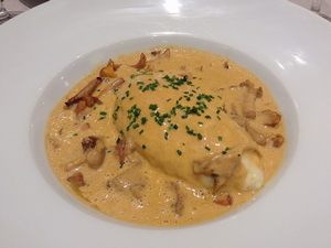 3品目は、クネル。クネルとは魚(川カマスなど)のすり身をフットボール形にし、ソースと合わせてオーブンで焼いたものでリヨンの名物料理。こちらの店ではホワイトソースにエクルビス(ざりがに)バターを合わせた、これも昔ながらのソースの一つであるナンチュアソースと共に提供されました。