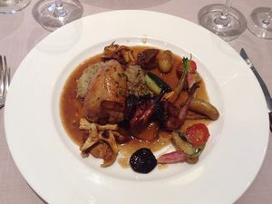 最後は、フルーツのコンフィを添えたドンブ地方産のウズラのロースト。ドンブ地方はリヨンの少し北、池や沼に覆われた湿地帯が多い地域です。カエルの名産地として有名ですが、同時にウズラの飼育も有名で、リヨン近郊ではカエルやウズラはなじみ深い食材です。