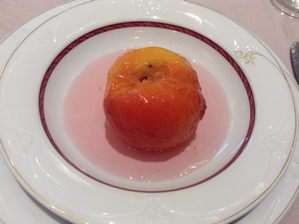 私はこの中から、しっかり焼いた発酵生地にラム酒のきいたシロップをたっぷり染み込ませた伝統菓子「ババ・オ・ロム」と旬のフルーツである黄桃のシロップ煮をいただきました。デセールも甘すぎず、料理でお腹は満たされていましたが、さらりと食べられました。