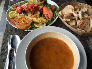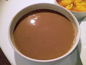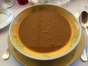ブイヤベースは基本的に魚を"ごった煮"にした料理ですが、お客に供される際には煮汁であるスープと、煮た魚は別々の皿で供されます。まずはスープから。
