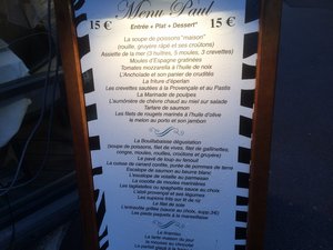 町のあちこちのレストラン店頭に見られるメニューの看板。様々な魚介料理と並んでブイヤベースは必ずといってよいほど入っています。気軽な店なら、前菜やカフェと合わせたコースで12~15ユーロ位のようです。