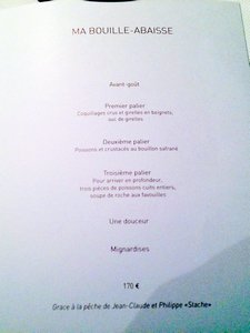 スペシャリテのブイヤベースのコースメニュー。価格は1人前170ユーロ