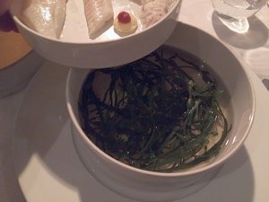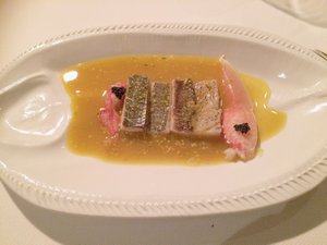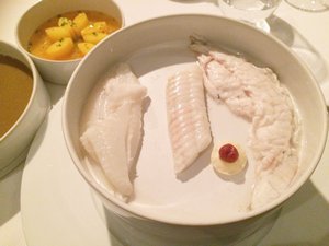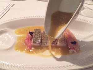 魚の身への火通り具合は総じて繊細で、ギリギリ火が入ったか、中心が半生位の状態に仕上げられています。このあたりは、さすが3つ星と思わせる丁寧な仕事ぶりです。スープはオマール海老、魚、野菜とサフランで味、色、香りをつけたものであるとお店の方は話しておられました。野菜の小さな角切りとフェンネルシードも入っていて、色は薄め。複雑で上品に仕上げられた風味です。