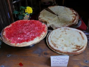 卵やバターをたっぷり使って練ったブリオッシュ生地を薄く丸く延ばし、バターと砂糖を振りかけ、高温のオーブンで焼いた菓子です。ペルージュの町に入ると、あちこちのパン屋やレストランの店先で売られている光景が目に留まります。