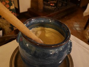 ここで食べるガレット・ペルージェンヌはちょっと特別です。生クリームが大きな壷に入って提供されます。各自お好みの量を皿に取りましょう。ちなみに、他のレストランでも生クリームを添えてくれるところはありますが、壷で出てくるのはこの店だけです。生地からほんのり香る、爽やかな柑橘の香りが食欲を増します。