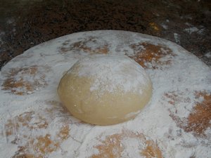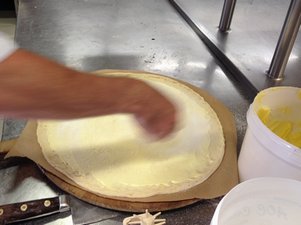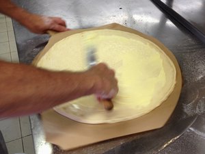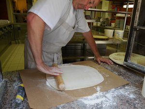 まずは生地作りから。こちらでは、ブリオッシュ生地にオレンジとレモンの皮を香り付けに入れているそうです。丸めて発酵が終わったものを、麺棒で丸く、薄く延ばしていきます。