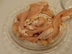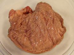 大きく切り開いて、中に残った血の固まりと、表面の薄い膜を取り除いてから使用する