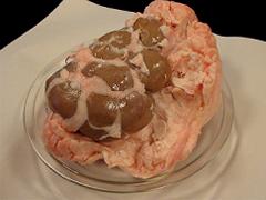 続いて腸である。小腸と大腸(しま腸)という手に入りやすいものの他に直腸(てっぽう)が一般的である。全て切り開かれた状態で、比較的きれいに掃除されたものが流通しているので、軽く洗えばそのまま料理に使うことが出来る。フランスではこの小腸や胃を使った「アンドゥイエット」という内臓を詰めた白いソーセージが有名である。特に直腸に詰めてしっかりと燻製したアンドゥイユはそのまま薄く切っても温めて食べても絶品で、私の好物のひとつである。