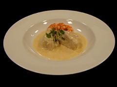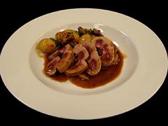 腎臓をローストし、グランメール風の付け合わせ<ラルドンとじゃがいものリソレ、小玉ねぎのグラッセ、シャンピニョンのソテ>と共に濃厚なソースの中で仕上げた一品(ラルドン=フランス風のベーコンを細い棒状に切ったもの)
