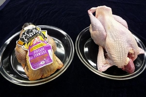 製品になったほろほろ鳥。左はフランス産、右は石黒農場産のほろほろ鳥。個体の色の差は飼料の違いによるものだとか
