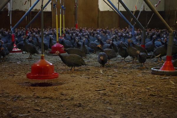 1つの鶏舎で最大1000羽の同時飼育が可能で、ここでホロホロ鳥はひなの状態から出荷に適した2キロの個体になるまで、約120日間生育されています。
