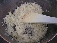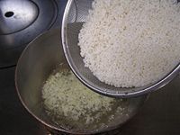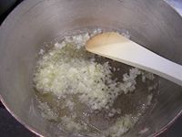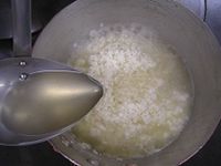 | まず、水で2~3回洗ってざるに上げておいた米を準備します | 玉ねぎを炒めます |