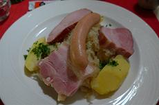 シュークルートは玉ねぎの薄切りをがちょう脂かラードで炒め、キャベツの塩漬け(シュークルート)を