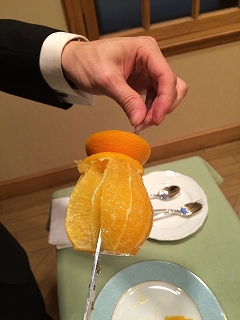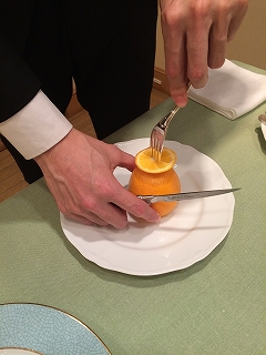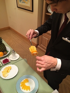 今回はゲリドンサーヴィスの一つとして、食材に直接手を触れずに切り分けるフルーツカッティングのサーヴィスをご紹介しました。