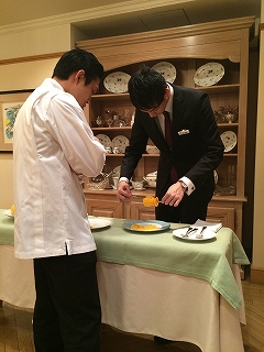 そのサーヴィスの仕事の一つに、お客様の目の前で料理を仕上げる、というものがあります。
