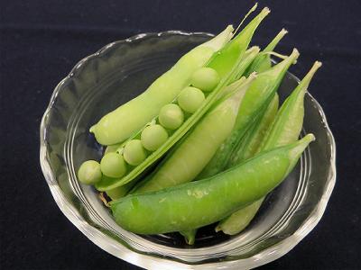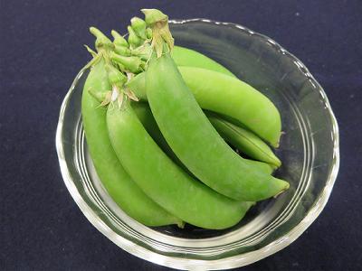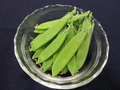 アメリカ生まれ、さやも豆も楽しめる食材で、我が家ではただゆでるだけでポリポリと食べることが多い。筋が太くてゆでると二つに割れてしまうことが多いので火通しはいつも控えめにしている。一般的には2分弱ゆでるといわれているが、私流は1分30秒を目処にして収穫後時間のたったものは少し長めにゆでるようにしている。控えめの塩でゆで、おか上げにして、用途に応じて熱いうちに軽く振り塩をするか、八方だしにつけるか、濃縮液体昆布だしを絡めるかを選ぶ。最近はさとうえんどう(さとうざや)という、甘みが強く、さやが薄く、豆のしっかりしたものが出回っていて、これはさらに早く火が通るので10秒早くを目処にしている。