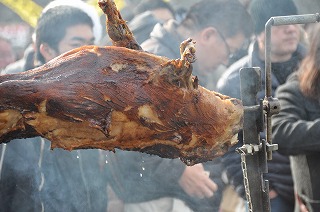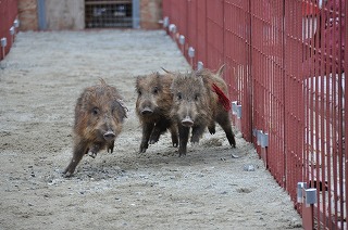 いのしし祭では、うりぼう(子猪)たちのレースがあったり、猪の丸焼きが振る舞われたりします。
