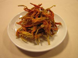 ●金針菜の乾燥 金針菜には鉄分が多く含まれていて、鉄分が多いとされているほうれん草の約20倍もあると言われており、貧血に効果があるとされています。別名「忘憂草(ぼうゆうそう)」と言われ、憂鬱な時や本調子でないとき、不眠にもよく効くそうです。