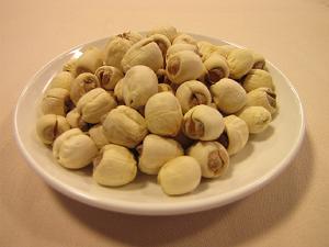 ●蓮の実の乾燥 胃を丈夫にし、イライラを抑える作用があります。蓮の実は生のままでも食べられますが、一般的には乾燥品が売られており、甘納豆のような砂糖漬けのものあります。
