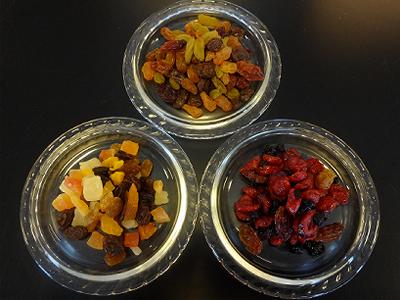 写真:レーズンミックス(奥)・ドライフルーツミックス(左)・ドライベリーミックス(右)