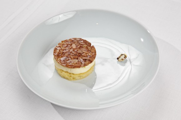 デザートの「ビーネンシュティッヒ」は、小さめの円形に仕上げられている。 *Restaurant Tim RaueのFacebook、2013年6月20日付けの「staatsbankett USA」にて、 晩餐会の料理の写真が紹介されている。 https://www.facebook.com/media/set/?set=a.578129462209892.1073741830.119829808039862&type=1