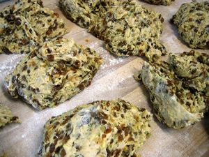 左:生地に投入する前のドライフルーツとアーモンドを混ぜたもの。
