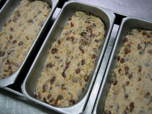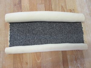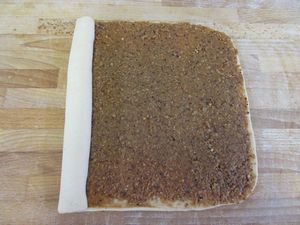 フィリングを塗り広げて巻き込み、型に入れて焼いたヌスシュトレン。