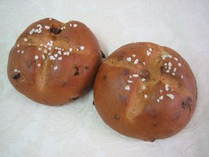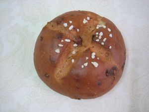 オースターフラーデン(Osterfladen)とも呼ばれる、ドライフルーツやアーモンドを入れた、復活祭の頃に焼かれる丸い発酵菓子。焼成前、その表面に十文字、または格子状の切り込みを入れる。