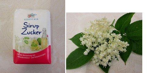 ニワトコの花序を軽く濯いだ後、滴を切り、硬い茎を取り除く。「ズィールップツッカー」を湯の中に溶かし入れ、煮立って溶液が澄んできたら、花の上から掛ける。48時間、涼しい場所に置く。