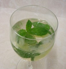 夏向きの涼しげなカクテル「フーゴ」は、ワイングラスで楽しまれる。