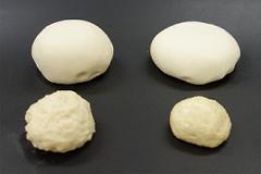 O: 膨らみ方が全く違いますよね。それぞれの粉から抽出できるグルテン量も比較してみましょう。写真左上が強力粉で作った生地で、その下が生地から抽出したグルテンです。右は薄力粉の生地とグルテンです。見た目でもグルテンの量の差がはっきりとわかります。