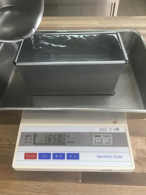 型いっぱいまで水を入れ、水の量を計量します。写真のように秤の上にバットをのせ、その中に型を入れておくと水がこぼれても安心です。