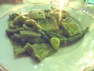 現地を訪れた際、レストランにこれらの料理がありましたが、私がこれらの料理とは別に興味を惹かれた料理があります。それは「テスタローリのジェノヴァ風ペスト和え」です。料理を選ぶ際、ペストを使用した料理はどれかと迷っていたら、レストランのオーナーから勧められた1品を選ぶことにしました。出てきた料理はパじゃがいも、いんげんと共にペストに和えられたシンプルなパスタ料理でしたが、今まで見てきたパスタとは一見違う装いでした。それはゆであがったパスタに「焼き色」がついていたことです。
